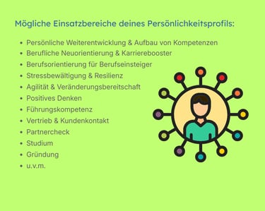 Das umfangreiche Persönlichkeitsprofil ist eine einzigartige Gelegenheit dich besser zu verstehen, Eigenverantwortung zu übernehmen und deine wichtigen Lebensbereiche so zu gestalten, wie es sich für dich richtig anfühlt.